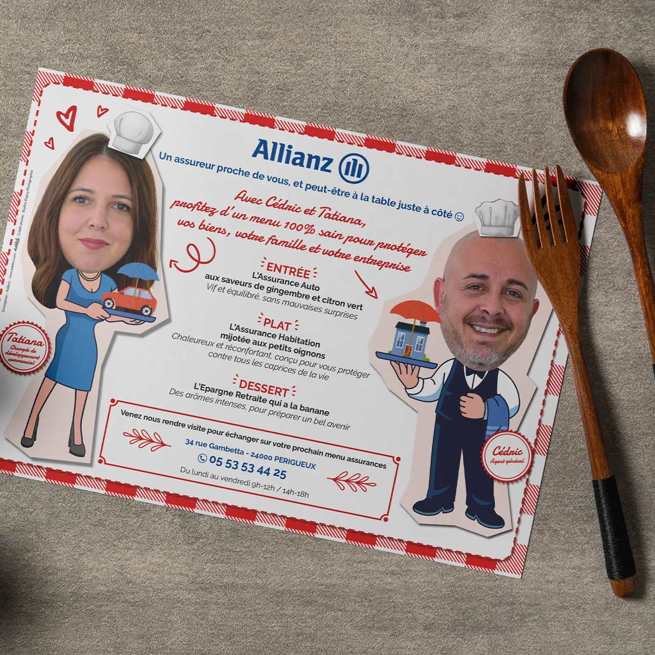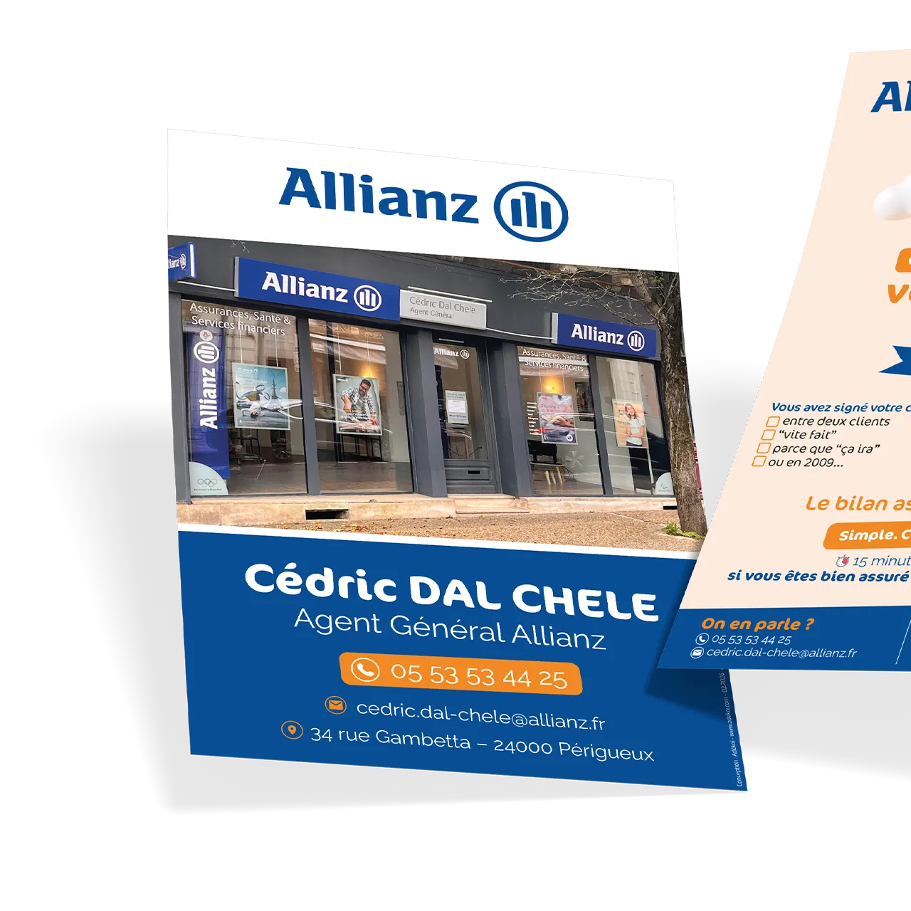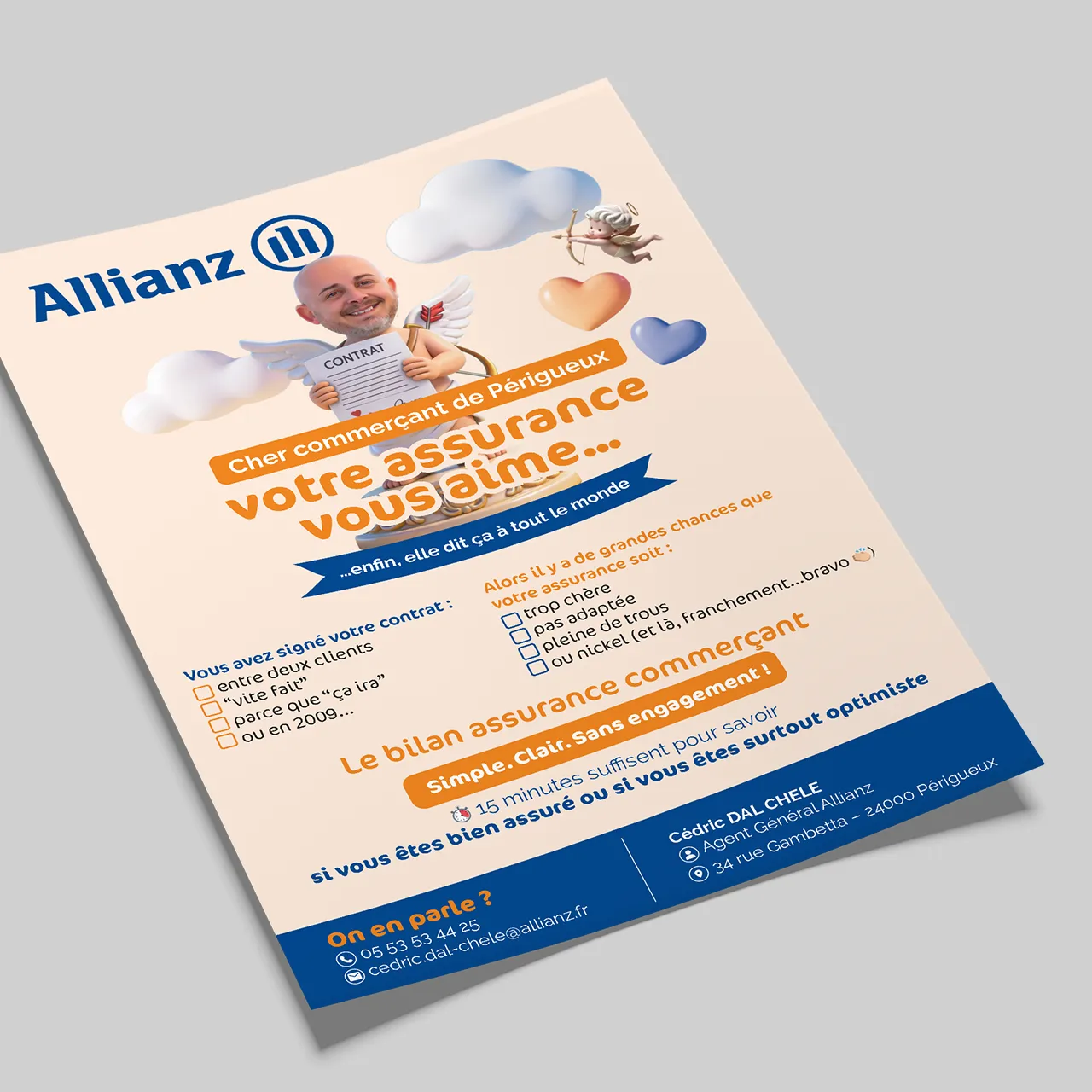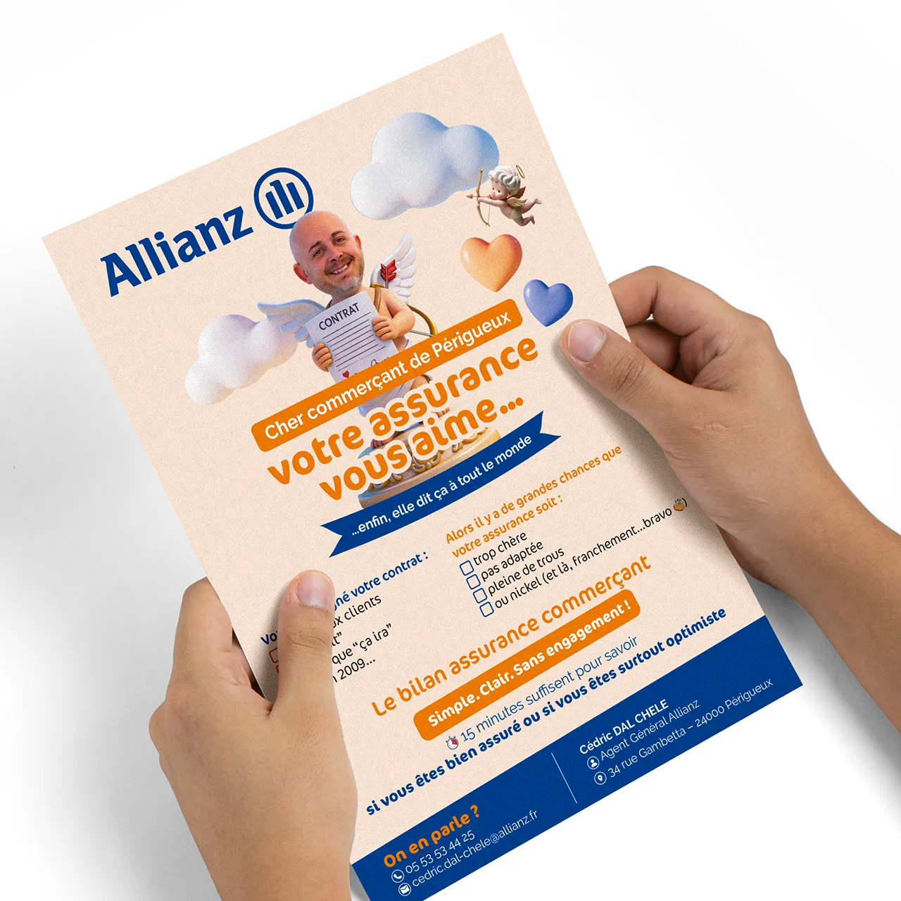Cédric Dal Chele, agent général Allianz Assurances à Périgueux, souhaitait développer sa clientèle de commerçants de proximité. Pour cela, il nous a demandé de concevoir un flyer original, qui casse les codes de la communication traditionnellement liée au secteur des assurances.