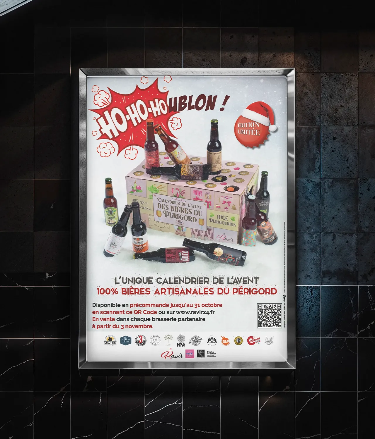 Nous avons opté pour un univers graphique décalé et joyeux, à mi-chemin entre bande dessinée et esprit de Noël, pour faire de ce coffret un vrai objet cadeau. L’illustration centrale, foisonnante et colorée, évoque à la fois les brasseries, les fêtes et le terroir. Ce parti pris fort a été repris dans la déclinaison affichage avec un visuel immersif, des bulles graphiques et une accroche bien sentie — « Ho-ho-houblon ! » — pour faire sourire et donner envie.